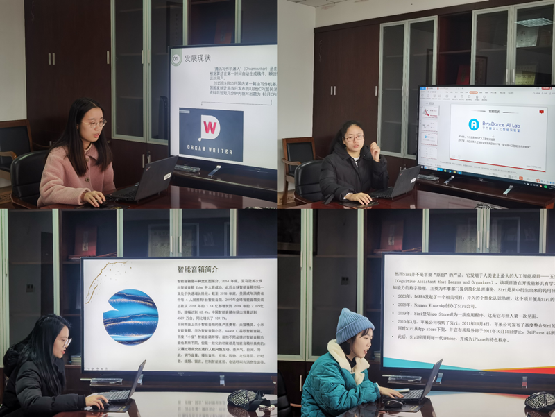 郑米玉同学以字节跳动人工智能实验室为分析对象,展示该实验室的发展现状和字节跳动的自然语言处理技术、计算机视觉技术、机器学习、数据挖掘等技术的研究成果,最后总结了字节跳动在智能社交、智能媒体、个性化搜索引擎和人工智能领域的未来规划。胡航桦同学以百度为例,探讨人工智能技术在传媒领域的应用。她首先介绍了百度以百度智能云和百度大脑为核心的人工智能布局,随后介绍了百度人工智能技术赋能传媒行业的大致路径,最后介绍了三个传统媒体利用百度人工智能技术解决行业困境的具体案例。胡婧同学以腾讯Dream Writer为例,介绍了国内机器人写作在传媒领域的发展现状以及机器人写作如何具体应用于传媒行业,最后她提出了机器人写作的未来构想,并对“机器人写作是否可取代记者编辑”的问题进行了探讨。赵赢同学以一段“华为智能音箱”的开箱视频为开头,提出了由智能音箱所引发的对“耳朵经济”、人机交互、人机对话的探讨。最后她总结道:虽然智能音箱面临着音频内容未出现爆发性的使用场景以及智能语音交互系统尚未完善的两大困境,但智能音箱在“语音新闻”、人机交互等方面仍有很大的发展前景。谢蕊同学以一段智能音箱与Siri“结婚”的趣味视频为开场,梳理了智能语音助手Siri的“前世今生”,并总结出Siri在智能媒体发展上带来的三大突破,即语音识别、人机交互和人工智能。但Siri仍面临着语音识别受限、使用场景受限、侵犯用户隐私等问题。胡欢同学以中央广播电视总台为分析对象,详细介绍了其推出的三个AI主播:康晓辉、小小撒和小冰。随后向老师和同学们介绍了中央广播电视总台在智能媒体领域的大胆尝试,如AI电视、人工智能编辑室、BTV融媒体演播室等。方雪蓝同学以微软小冰为例,介绍了微软小冰在媒介领域的商业运营模式,并提出了媒体智能化所面临的对媒介从业者角色的冲击和转型问题、“信息茧房”问题。最后她总结了以微软小冰为代表的人工智能技术在构建“场景文化”、突破传统媒介的时空限制以及提高人类信息敏感度等方面的可能性.
