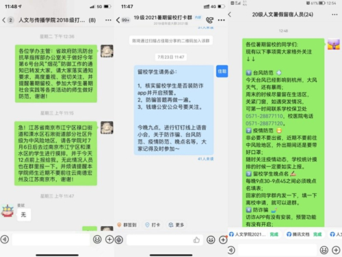 随后,各年级辅导员通过线上会议的形式,向全体留校学生传达了学校和学院的通知精神,要求同学们关注台风动态,减少外出,注意安全,晚上准时在寝室进行安全报备,如遇突发情况要第一时间联系学院老师或学校保卫处、校医院。会议同时也传达了学生留校期间的疫情防控、防范网络诈骗等相关要求。