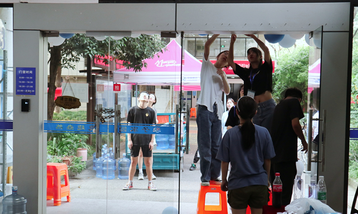 钱江湾生活区21级新生的报道地点设在33幢和39幢公寓楼,在这里,学院学生会早已拉起横幅,挂起气球和星星装饰,充满热情地等待着新生的到来,希望为他们提供最细致的服务。