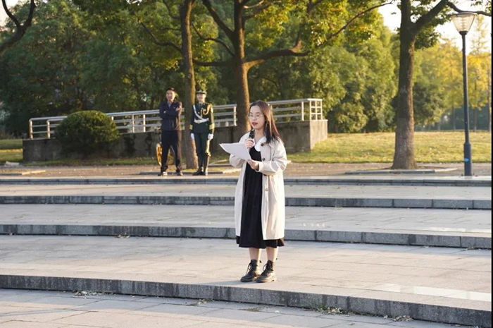 11月15日,迎着清晨的第一缕阳光,H图书馆 在鸽子广场进行了本学期“榜样引领·励志前行”主题升国旗仪式,学院党委副书记林琳,学办主管王阳光,辅导员易正逊、黄凡、占佳聪、徐玉怡,以及全体21级本科生参加了此次活动。活动由黄凡主持。