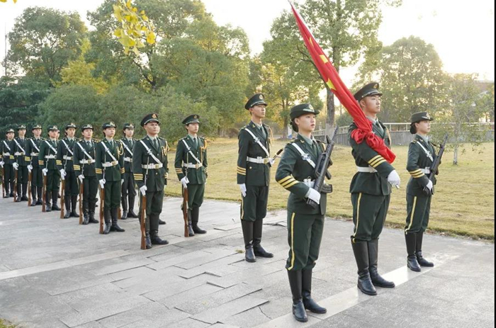 国旗护卫队全体队员迎着朝阳,踏着矫健的步伐,以饱满的热情,庄严地护卫五星红旗进场。