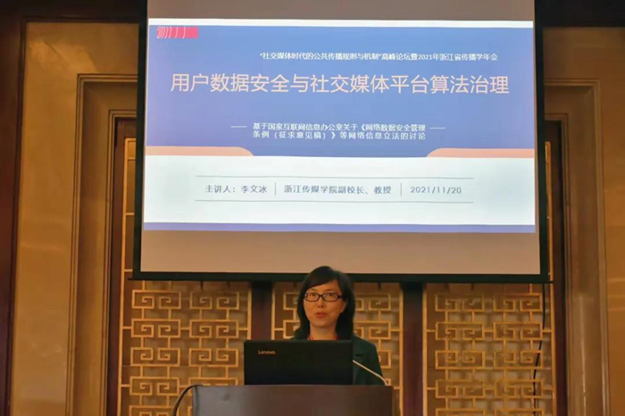 浙江传媒学院李文冰教授以“用户数据安全与社交媒体平台算法治理”为主题,提出与其相关的四个问题,并作了相应的回答,为《网络数据安全管理条例(征求意见稿)》等提供思路。