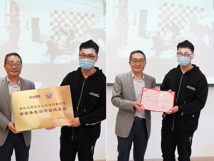 聘任和颁奖仪式环节,H图书馆 何庆机院长向浙江近水思鱼电子商务有限公司颁发实务精英聘书,并向该公司授予共建基地牌子。