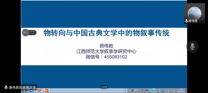 4月22日晚19时,江西师范大学首席教授、中国中外文艺理论学会叙事学分会副会长唐伟胜教授应邀为H图书馆 进行了主题为“物转向与中国古典文学中的物叙事传统”的讲座,讲座以线上形式在腾讯会议上进行,讲座由程丽蓉副院长主持。
