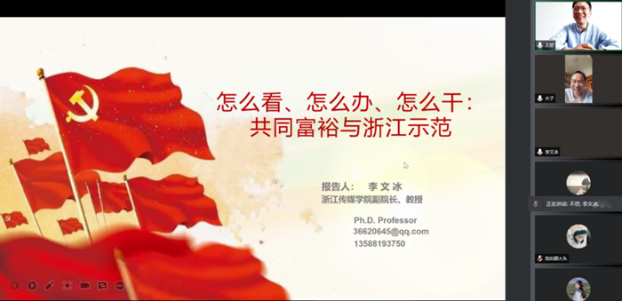 随后,李文冰教授分析了浙江扎实推进共同富裕的基础优势和发展目标,介绍了浙江省建设共同富裕示范区的现实探索。浙江省重视平台经济和特色经济,依靠科技创新和数字变革的手段,多措并举、补齐短板,支持山区26县发展,不仅做大蛋糕、而且分好蛋糕。她以桐乡市濮院镇和平阳县为例,展示浙江传媒学院校地合作探索共同富裕的经验。浙江传媒学院与当地政府通过科技创新、数字变革等手段,将单一生产基地打造成数字化美丽景区,大幅提升了当地人民的收入水平,校地合作打造出共同富裕标杆。