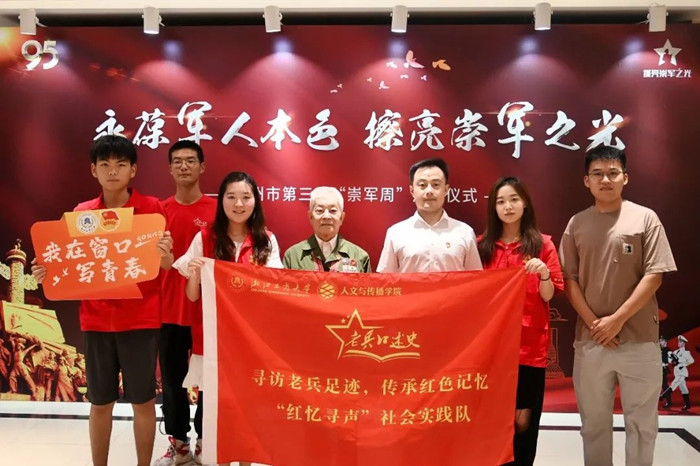 H图书馆 “红忆寻声”实践队前往杭州市退役军人服务中心,协助举办杭州市第三届八一“崇军周”启动仪式,采访战地记者俞凤楼、标图兵沈华成,与退役军人一起共同迎接建军95周年。