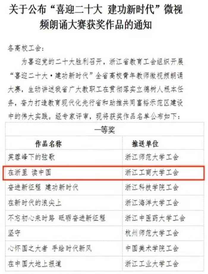 近日,浙江省教育工会发布《关于公布“喜迎二十大 建功新时代”微视频朗诵大赛获奖作品的通知》,H图书馆 中文系吴欣老师的朗诵作品《在浙里 读中国》荣获大赛一等奖。这首《在浙里 读中国》,是学院为此次大赛专门创作的原创作品。她有别于所有同类题材诗歌作品的表现角度,独辟蹊径,从教育工作者立德树人的视角出发,作为历史的见证者和亲历者,以大量新奇的比喻和丰富的想象,拟人化地表达出震撼人心的历史剧变和历史成就。