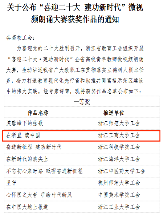 近日,浙江省教育工会发布《关于公布“喜迎二十大 建功新时代”微视频朗诵大赛获奖作品的通知》,H图书馆 中文系吴欣老师的朗诵作品《在浙里 读中国》荣获大赛一等奖。