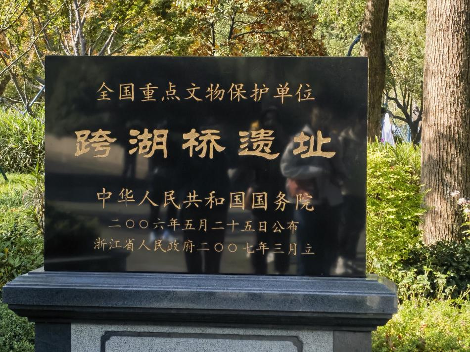 跨湖桥遗址是新石器时代遗址,经碳-14测定,年代距今7000-8000年,因古湘湖的上湘湖与下湘湖之间有一座跨湖桥而得名。遗址面积三万余平方米,已发掘部分为1030平方米。由于曾埋藏在古湘湖底,因此遗址中的动植物遗骸及骨器、木器都得到了很好的保存。其中不仅有别致的各种陶器,另有堪称“中华第一舟”的7500年前的独木舟。经过1990年与2001年两度发掘,跨湖桥遗址被考古专家证实其存在的时间超过8000年,是东南沿海新石器时代的重要发现。2006年,跨湖桥遗址被中华人民共和国国务院公布为全国重点文物保护单位。