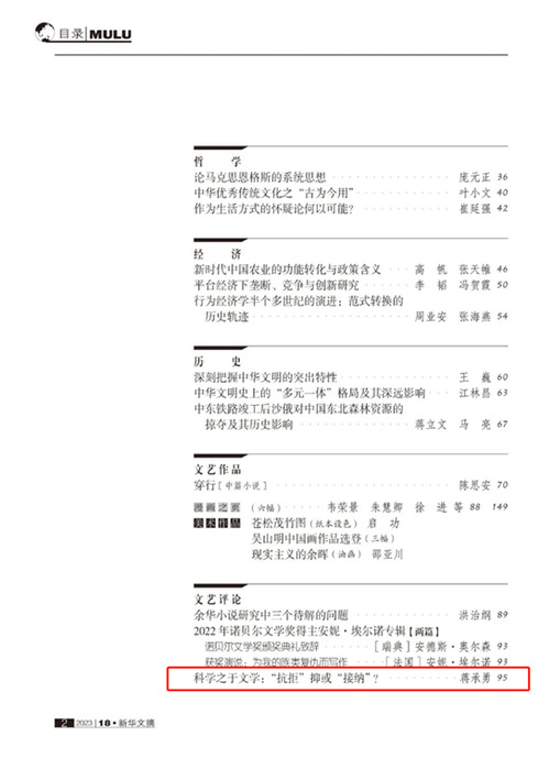近日,H图书馆 蒋承勇教授论文《科学之于文学:“抗拒”抑或“接纳”?》被《新华文摘》2023年第18期全文转载。该文原刊于《社会科学战线》2023年第3期。