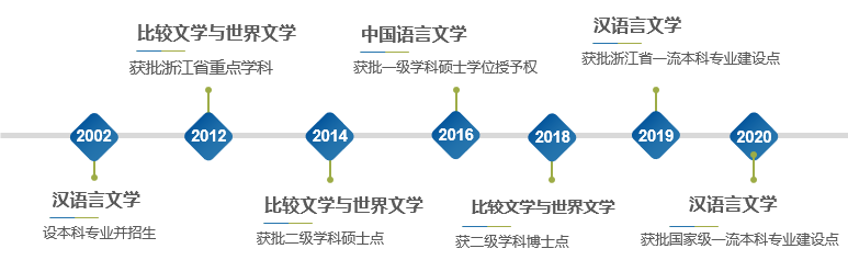 中国语言文学一级学科硕士点下设比较文学与世界文学、中国现当代文学、文艺学、汉语言文字学、中国古代文学、中国古典文献学等6个二级学科硕士点。其中“比较文学与世界文学”为浙江省重点学科、省级一流学科“外国语言文学”的重要支撑和一级学科博士点“外国语言文学”下设的二级学科点。