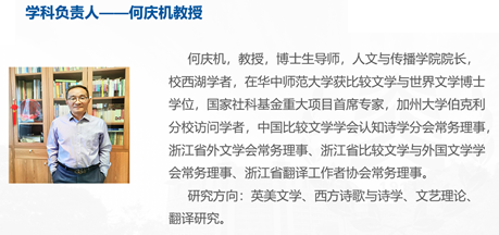 学院院长何庆机教授为国家社科基金重大项目首席专家,加州大学伯克利分校访问学者,中国比较文学学会认知诗学分会常务理事,浙江省外文学会常务理事,浙江省比较文学与外国文学学会常务理事,浙江省翻译工作者协会常务理事。