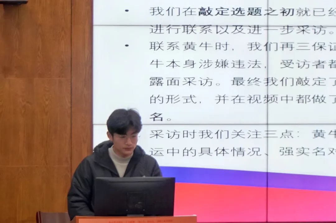 第六组《买票难过黄牛关》通过对亚运会期间黄牛卖票的现象分析,为大家说明了强实名制的优劣,并大胆预测了黄牛行业的前景,表达了对未来有效打击黄牛行业的期待。