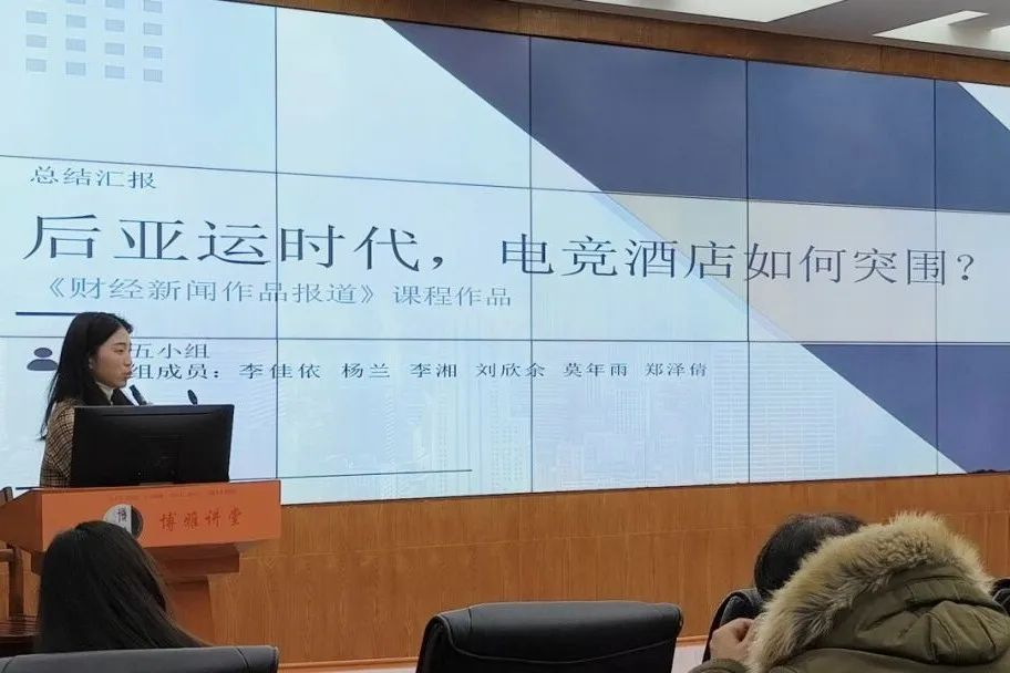 第九组《后亚运时代,电竞酒店如何突围》通过《财经资讯》新闻报道,向大家展示了因为亚运会电竞赛事的热潮而随之火起来的电竞酒店,并分析了它的市场前景,整个报道层层递进,最后提出了电竞酒店应实现“专业化、规模化、品牌化”的建议。
