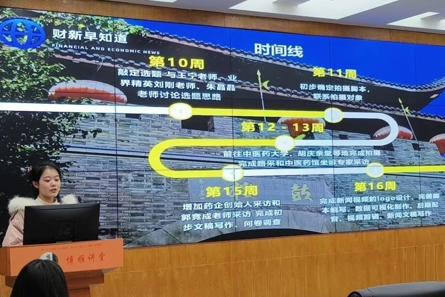 第四组《杭州定制武术服装,如何龙腾海内外》为我们展示了定制武术服装行业的市场规模和营收业绩,对于武术服装产业的提升提出了提高品牌效应、与“互联网+”相结合的建议。在展示的最后,第四组同学也发表了自己的课程感悟,表达了自己对于成为一个多边形的财经记者的希望。