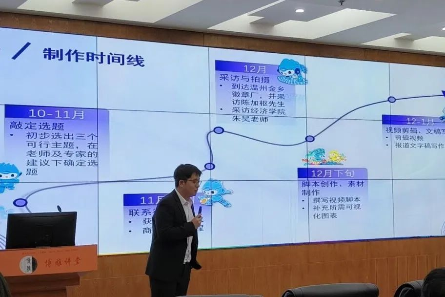 第三组《后亚运时代,“小龙舟”翻起经济大浪花》以龙舟为主体,结合了业内专家和龙舟制造商的意见,围绕着品牌建设及基础设施完善等方面,提出了自己的见解。作品展映后,小组成员以PPT的形式向大家讲解了作品制作的背景与故事。