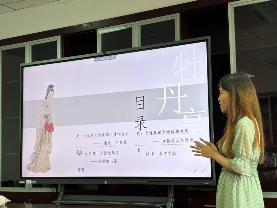 廖世钧同学以文本细读的方式,深刻剖析了《牡丹亭》中的女性意识。从文本上可读的意识生发与对象化到女性意识在《牡丹亭》读者中的延伸,再到选择这个选题时她的心得体会,层层推进,将师生们带进《牡丹亭》的世界。在给予建议的同时,老师们也对课程学习促进自我成长的学习方式表示鼓励。