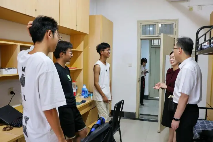 图为校党委书记及学院老师走访新生宿舍