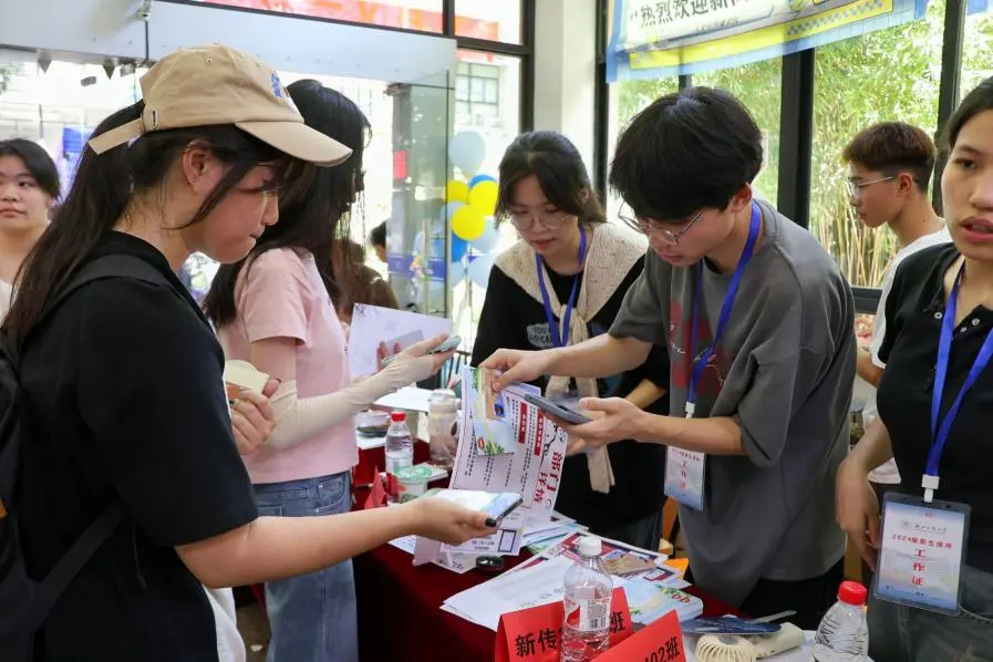 图为班助和志愿者指引新生报道