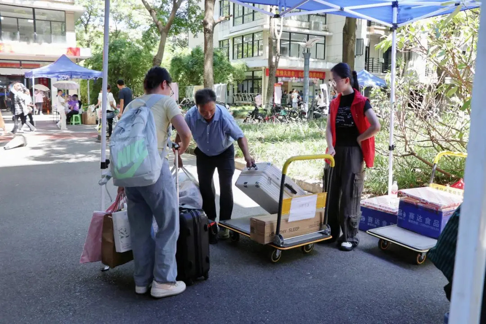 图为志愿者帮助新生搬运行李