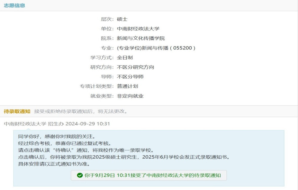 而在保研院校的选择上,胡思蔚采取了海投的策略,根据各院校面试时间和个人时间安排、个人能力考量等因素,参加了中南财经政法大学、华中师范大学、西北大学等六所院校预推免面试,并最终被中南财经政法大学录取。胡思蔚提到,在报名院校的过程中一定不能妄自菲薄,因为保研具有很强的机遇性,在最终录取前一切皆有可能。