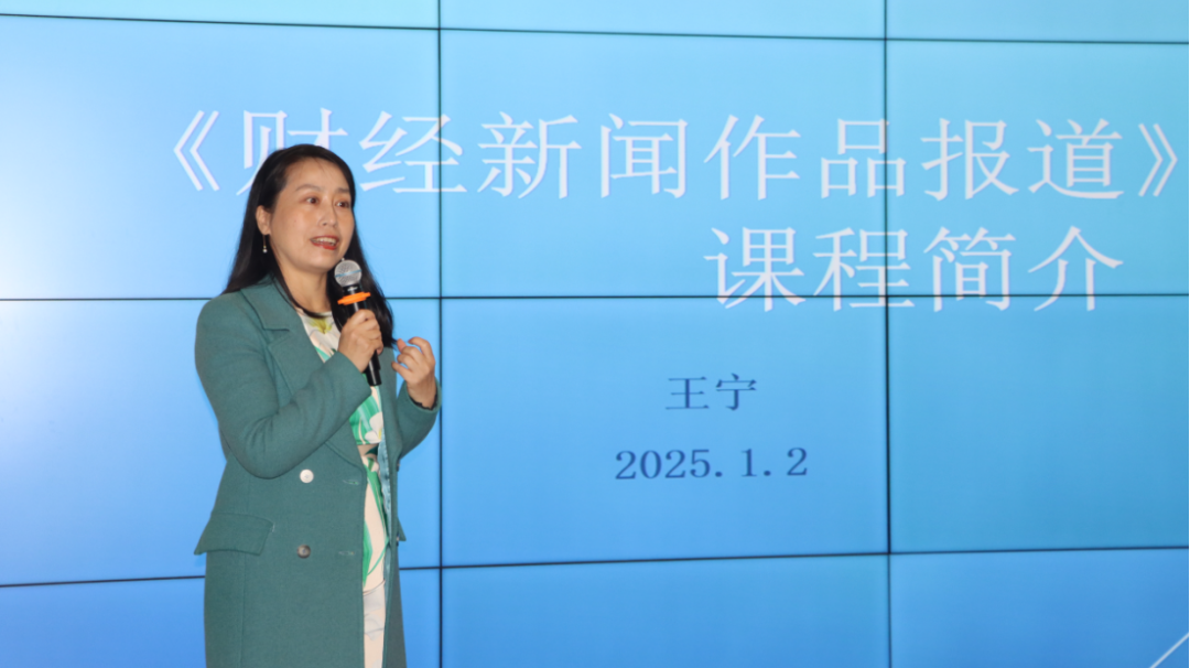 随后,新闻系王宁老师详细介绍了课程相关情况,包括课程设置的目标是培养学生敏锐的财经新闻洞察力和扎实的报道能力,以及在课程中如何引导学生进行选题挖掘、采访调研和文案撰写等,让在场人员对活动背景有了更深入的了解。